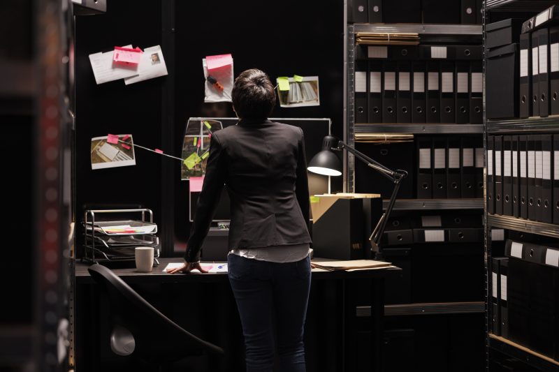 Criminology inspector looking at investigation board analyzing mysterious crime evidence, working overtime in federal bureau. Private detective planning confidential strategy to catch fbi suspect